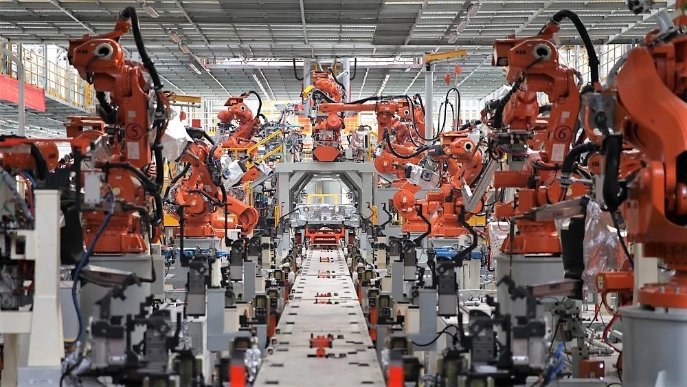 Так, например, выглядит цех сварки, где уже можно рассмотреть кузов автомобиля, удерживаемый манипулятором.