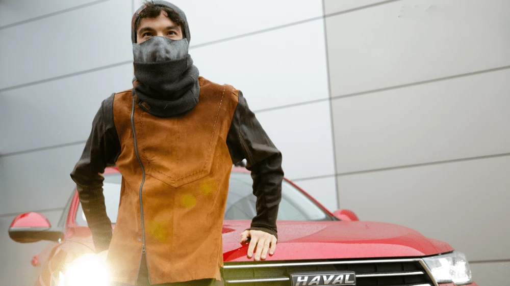 На фото: модель на фоне кроссовера Haval H6.