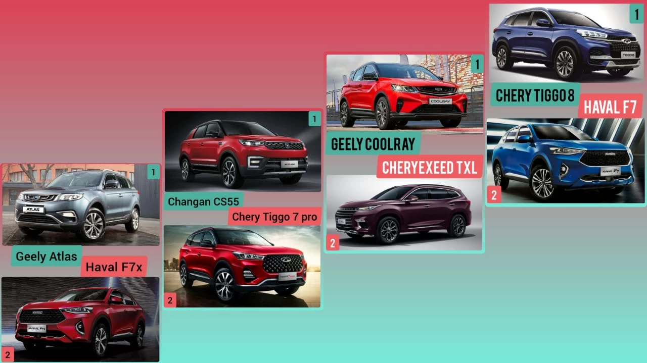 Какой из китайских автомобилей лучше? Haval F7 или Chery Tiggo 8? Geely Coolray или CheryExeed TXL? Changan CS55 или Chery Tiggo 7 Pro? Geely Atlas или Haval F7x?