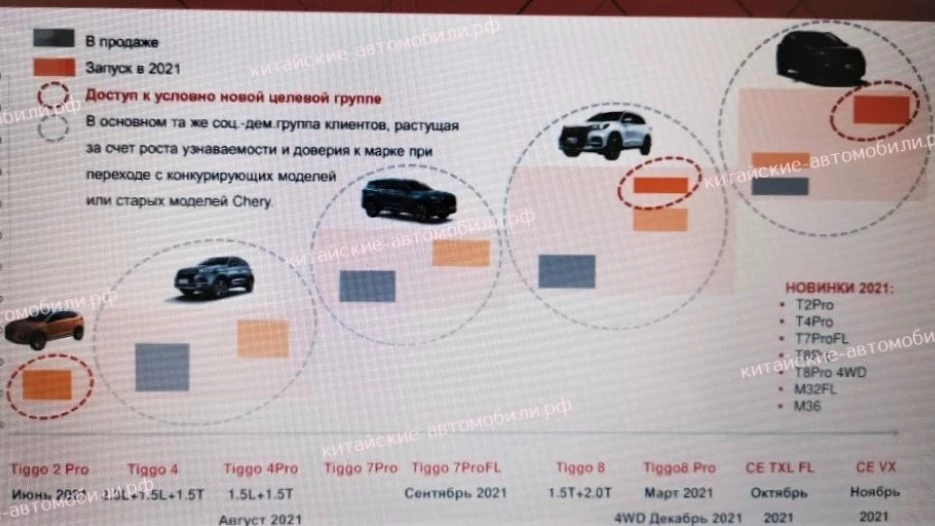 Список моделей назвал портал «Авторевю», который ссылается на оказавшийся в его распоряжении «план вывода новых моделей Chery и Cheryexeed на российский рынок в 2021 году». «Китайские автомобили» публикуют фото этого самого плана, который дополнит информацию коллег.