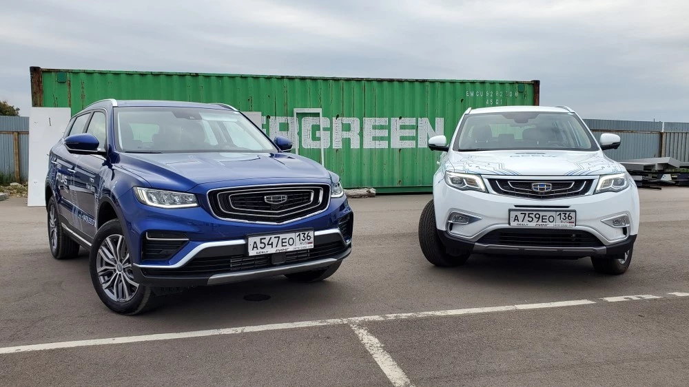 На фото: кроссоверы Geely Atlas Pro (синий) и Geely Atlas (белый)