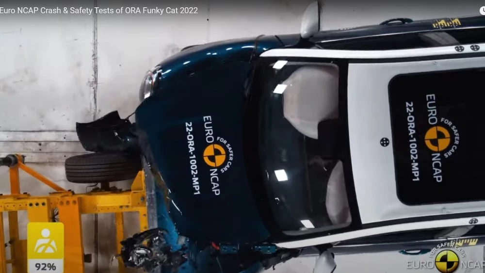 На скриншоте с видео: фрагмент краш-теста хэтчбека Ora Good Cat / Funky Cat