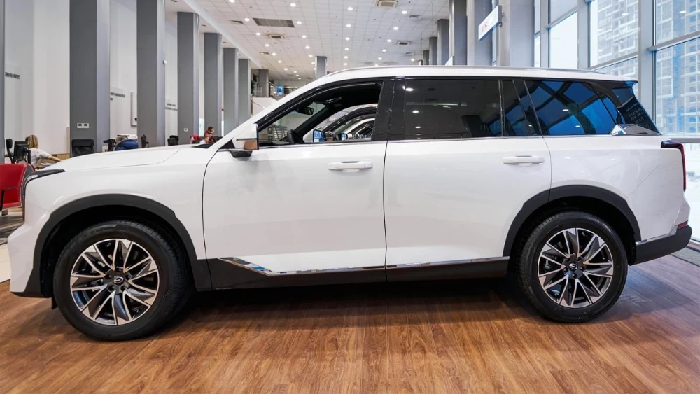 Профиль лишний раз подчеркивает внушительные размеры внедорожника – а это 4980 мм в длину, 1950 мм в ширину и 1780 мм в высоту при колесной базе 2920 мм. Причем на этот раз GAC GS8 II выглядит одинаково большим и на фото, и в жизни. Также здесь большая площадь остекления, что положительно влияет на обзорность. Пороги остаются чистыми, благодаря длинным дверям, которые их закрывают.