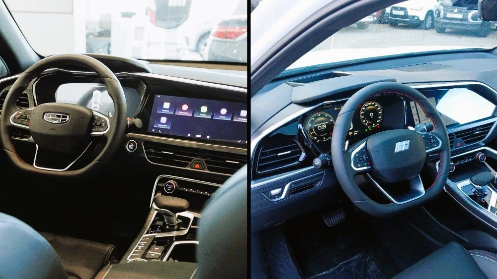 Интерьер кроссовера Geely Tugella и Knewstar 001 / фотоколлаж «Китайских автомобилей»
