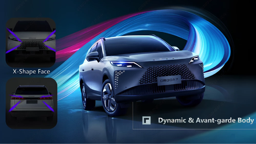 Кроссовер Omoda C7 выполнили в стилистике Art In Motion («Искусство в движении»). В передней части автомобиля разместили безрамочную решётку радиатора, крупный воздухозаборник, вытянутые фары и интерактивную подсветку. В задней части разместили фонари с рисунком в виде молнии. Другие особенности кузова – дверные ручки «заподлицо», а также световые элементы на задних стойках.